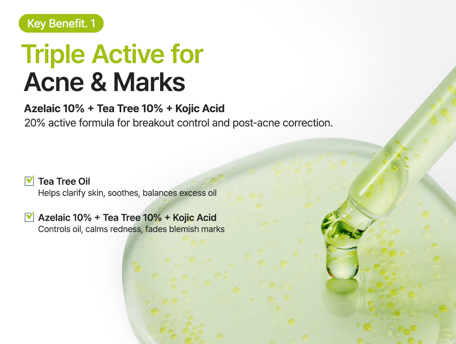 One drop, triple effect—target breakouts and post-acne marks with a clarifying active synergy.