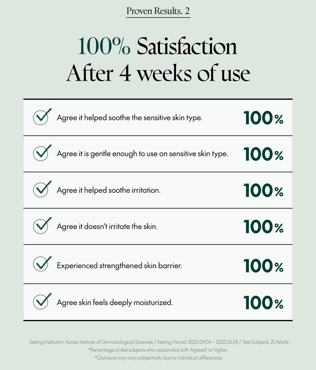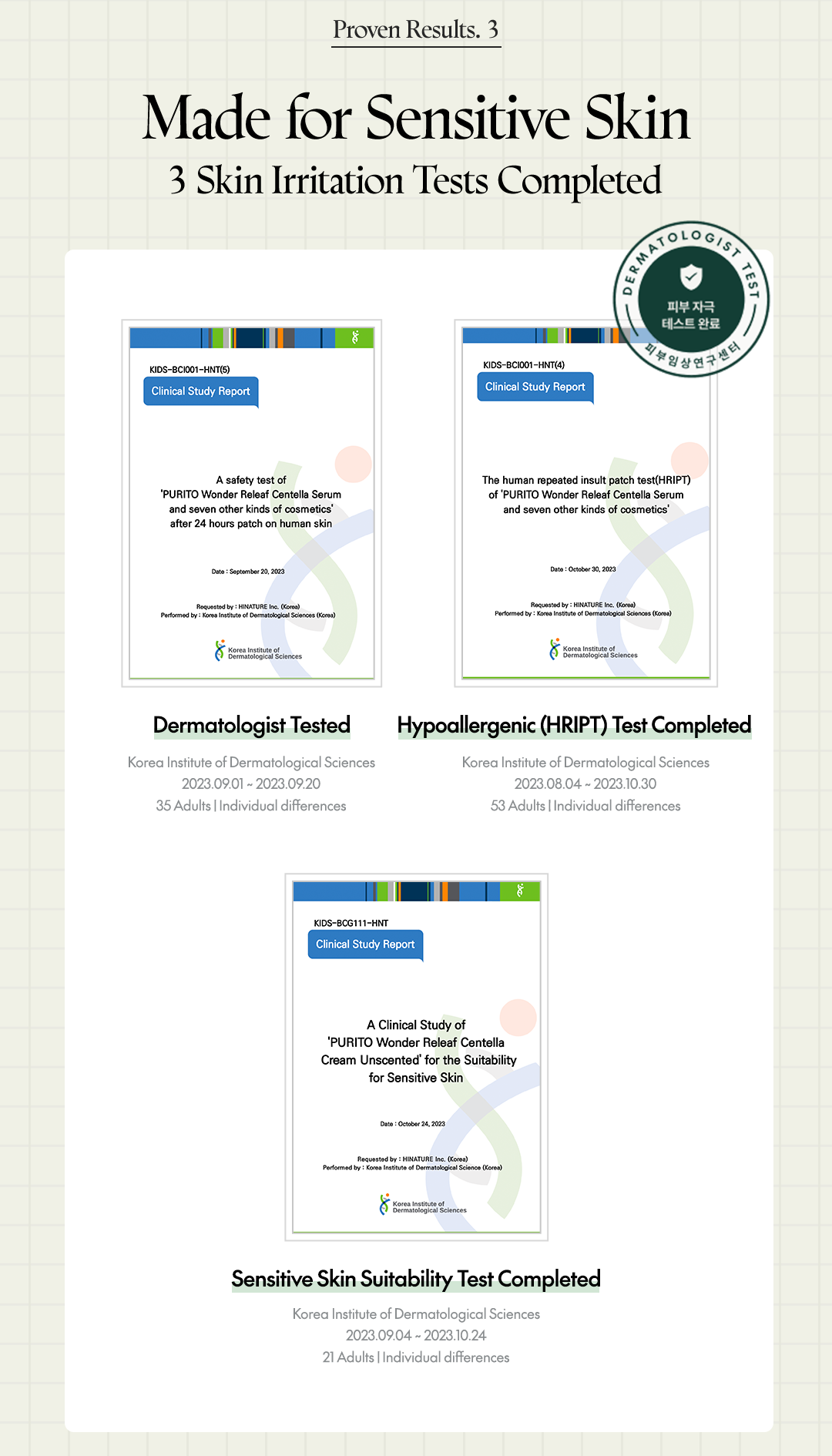 - Sensitive Skin Suitability Test Completed (Korea Institute of Dermatological Sciences) / 2023.09.04 ~ 2023.10.24 / 21 adults